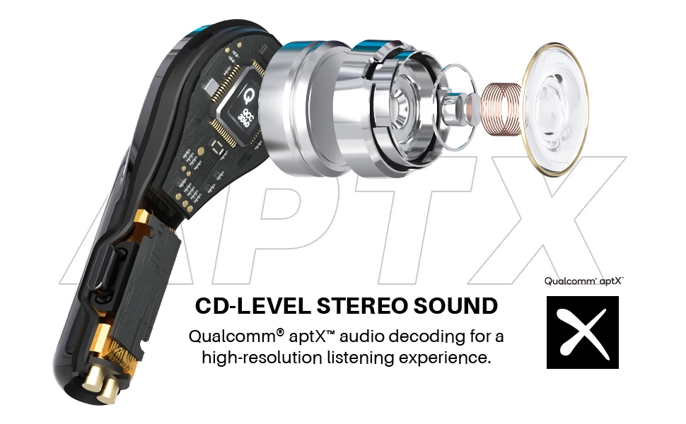 Gracias al avanzado decodificador Qualcomm aptX de alta resolución, permite soporte de audio de 16 bits con una frecuencia de muestreo de 48Khz, lo que se traduce en un ultra claro, ¡Experiencia auditiva realista y de calidad de CD!