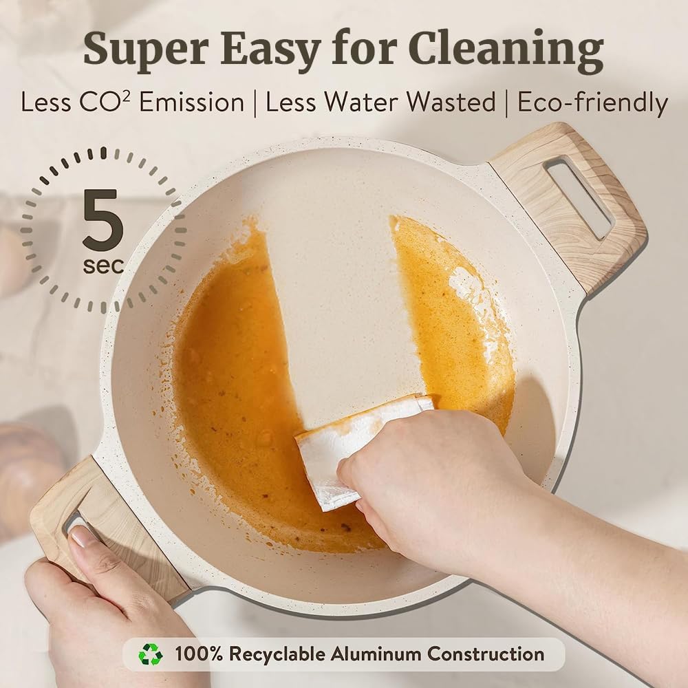 • 【Antiadherente y Fácil Limpieza】Fondo de acero inoxidable engrosado para un mejor rendimiento antiadherente y sin pasta, simplemente enjuáguelo la set de ollas y sartenes antiadherentes con agua, lave los platos más fácilmente y ahorre más tiempo. También es un juego de ollas y sartenes apto para lavavajillas.