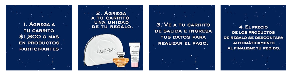 Al ordenar $1800 MXN o más en productos Lancôme seleccionados, disponibles, vendidos y enviados por Amazon México obten productos gratis al agrégalos a tu carrito de compra.